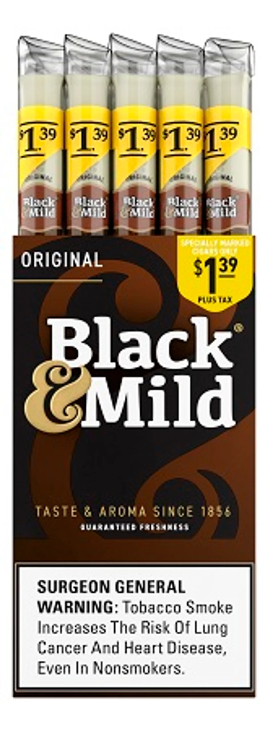 Enjoy the rich aroma and smooth taste of Black & Mild Cigars, now available for just $1.39. These machine-made cigars feature premium pipe tobacco encased in a homogenized tobacco leaf (HTL) wrapper, delivering a consistently smooth, flavorful smoke with every puff.
