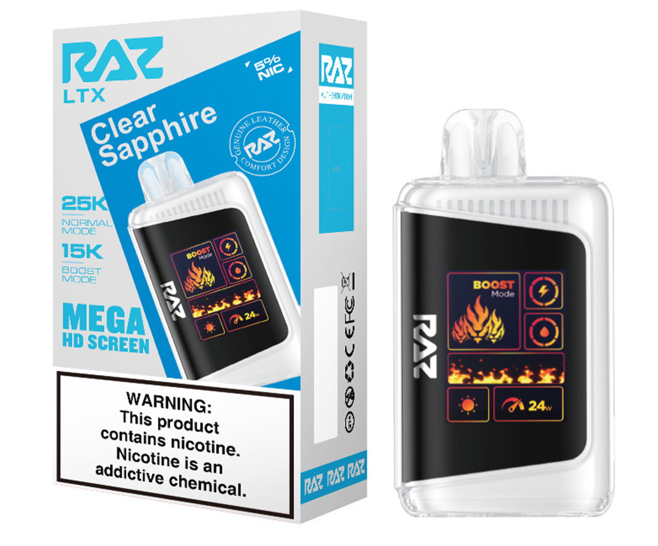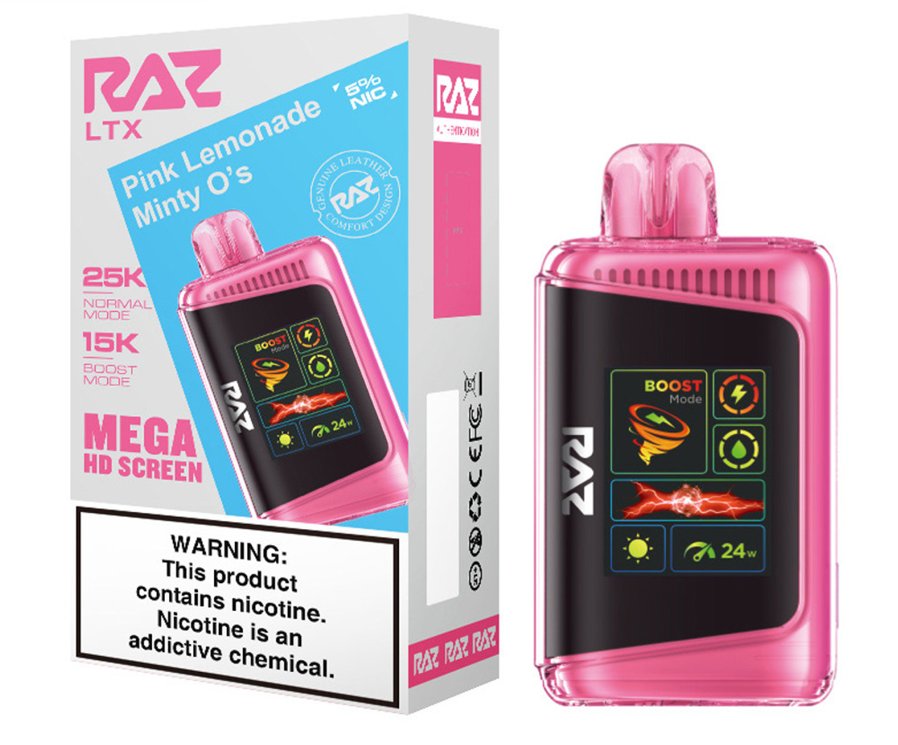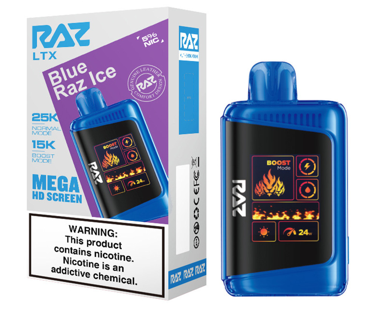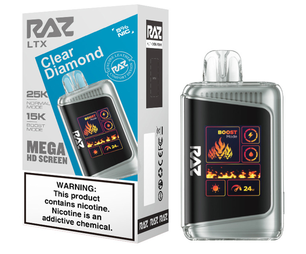 Step up your vape game with the RAZ LTX 25K, the latest evolution of the fan-favorite RAZ LTX 25000 series. This advanced disposable device combines cutting-edge performance, style, and convenience in a sleek, leather-finished design. Featuring up to 25,000 puffs in Normal Mode and 15,000 puffs in Boost Mode, the 16ML e-liquid capacity and 800mAh rechargeable battery ensure extended enjoyment with zero interruptions.