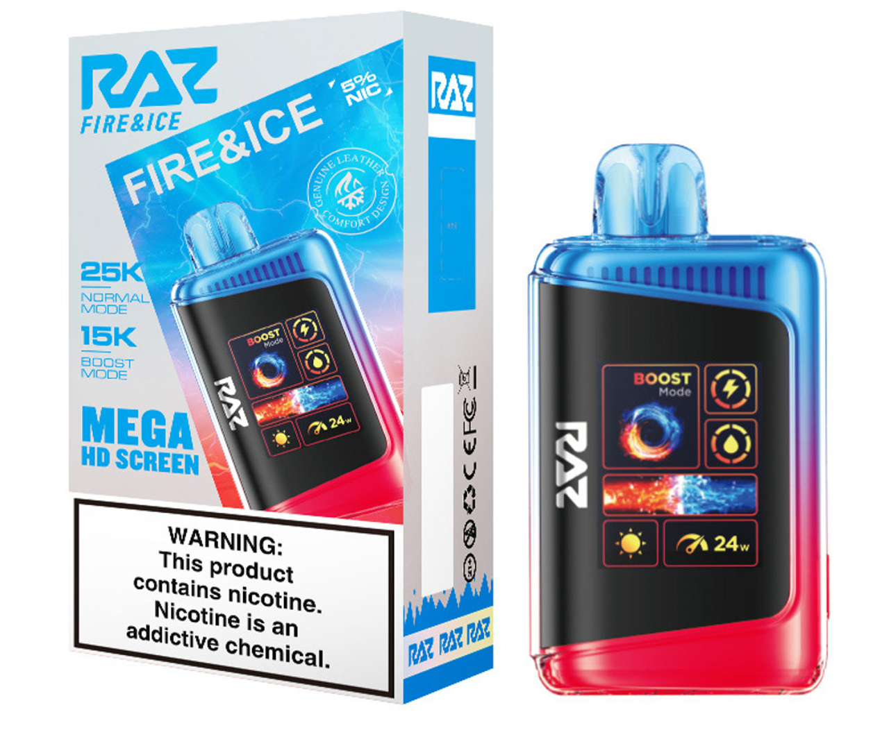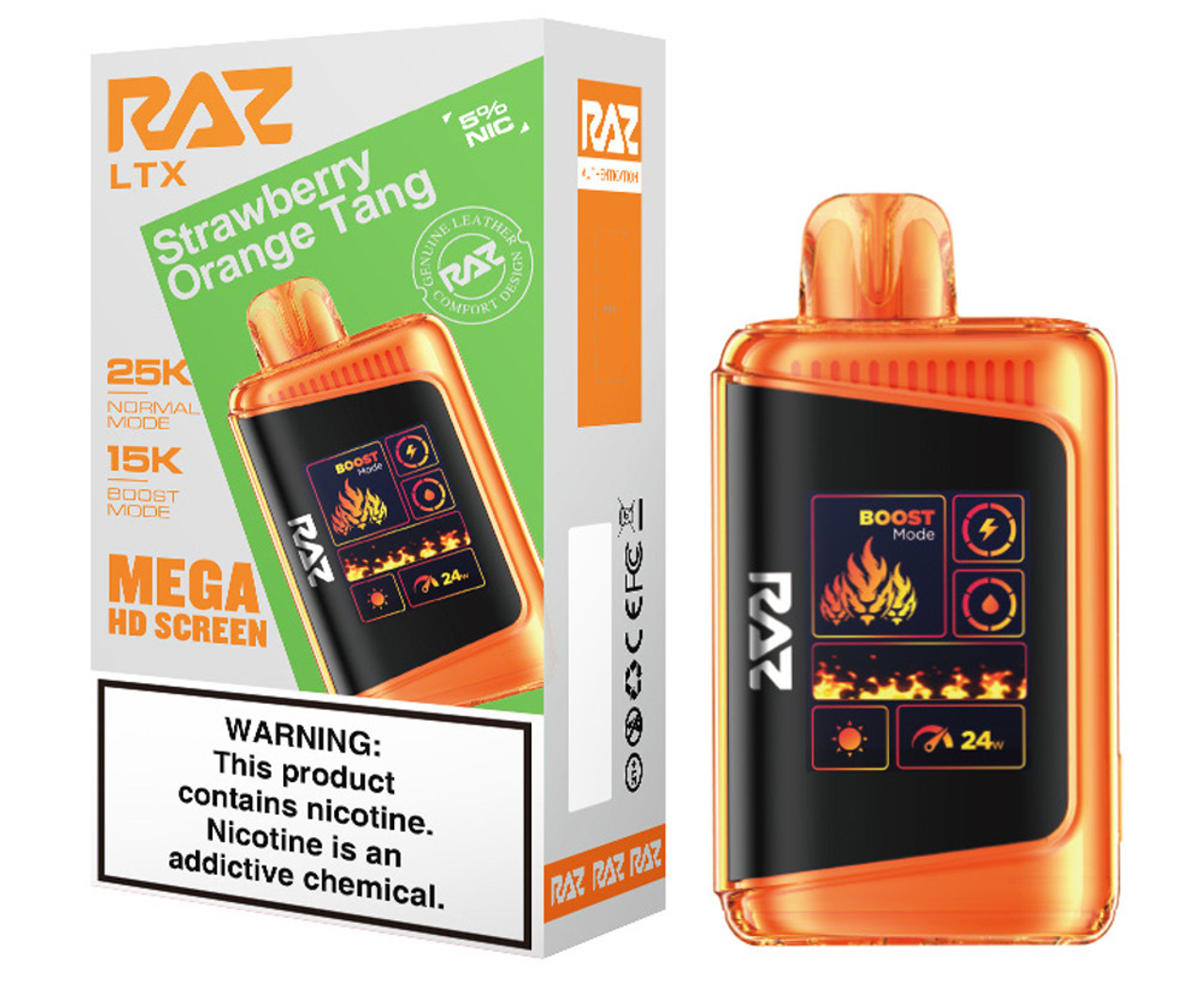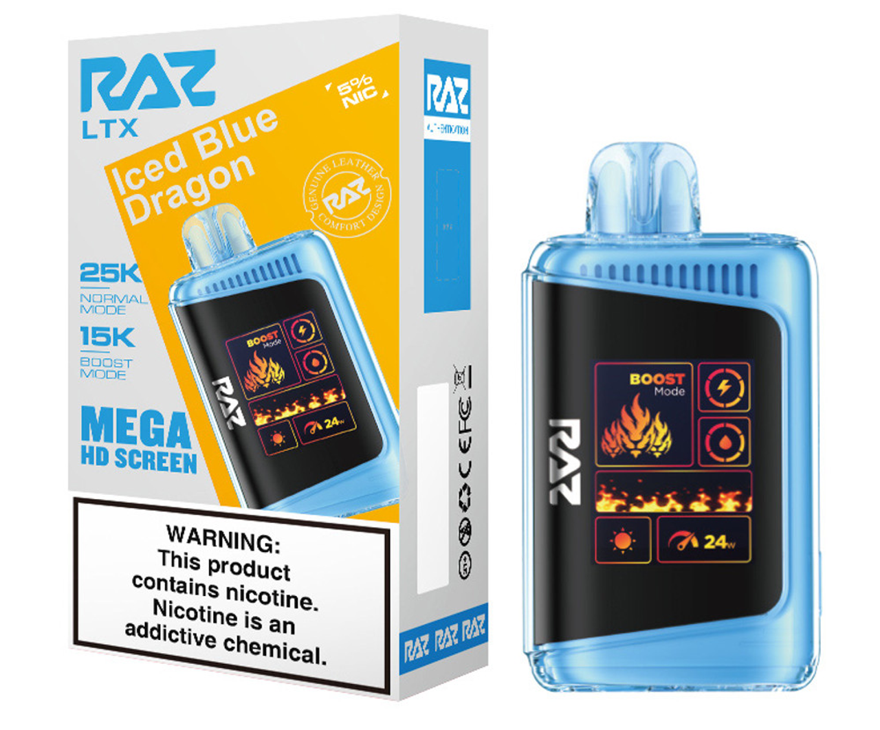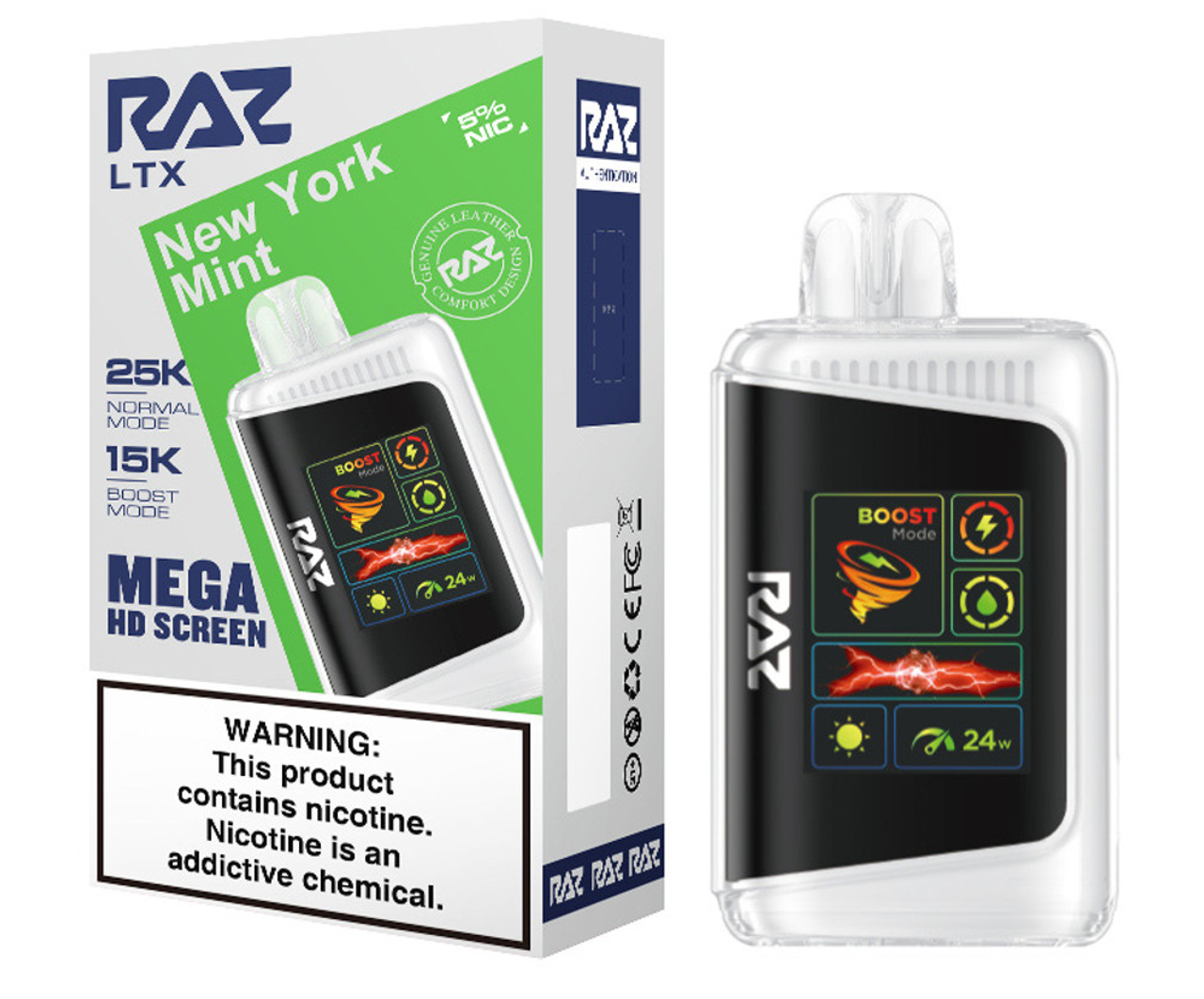 Step up your vape game with the RAZ LTX 25K, the latest evolution of the fan-favorite RAZ LTX 25000 series. This advanced disposable device combines cutting-edge performance, style, and convenience in a sleek, leather-finished design. Featuring up to 25,000 puffs in Normal Mode and 15,000 puffs in Boost Mode, the 16ML e-liquid capacity and 800mAh rechargeable battery ensure extended enjoyment with zero interruptions.